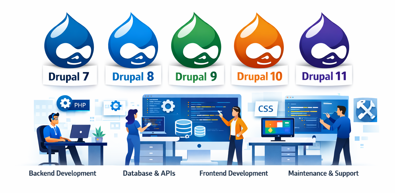 We provide reliable development, maintenance, and upgrade services across all major Drupal versions. From legacy Drupal 7 systems to modern Drupal 10 and 11 platforms, our team ensures stability, security, and long-term performance for every stage of your Drupal ecosystem.